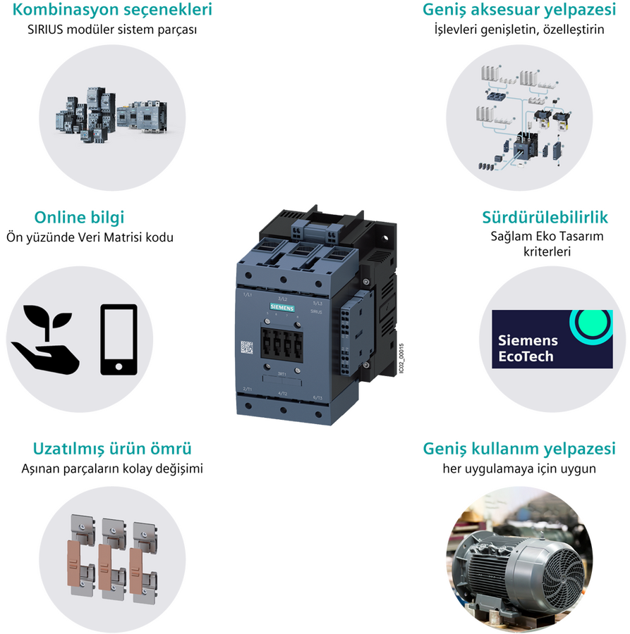 Siemens SIRIUS 3RT1 serisi güç kontaktörü motorların anahtarlanması için tasarlanmıştır. 400 V’da 200 kW . 400 A . 3 kutuplu yapı. AC/DC 230 V . Yardımcı kontaklar 2 (NO) ve 2 (NC) . Vida bağlantı klemensleri sayesinde kolay montaj imkânı sunar. SIRIUS sistem modülüne entegre edilebilir ve diğer bileşenlerle uyumlu